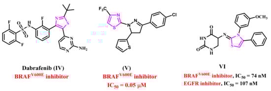 Abdel-Maksoud et al. also developed a novel series of thiazole-based derivatives for testing as BRAFV600E inhibitors. Compound V (Figure 2) exhibited the most potent antiproliferative activity, with potent BRAFV600E inhibitory activity and an IC50 value of 0.05 µM []. We recently reported the synthesis of novel thiazole-based derivatives that act as dual EGFR and BRAFV600E inhibitors []. Compound VI (Figure 2) demonstrated significant antiproliferative activity against EGFR and BRAFV600E, with IC50 values of 74 and 107 nM, respectively.