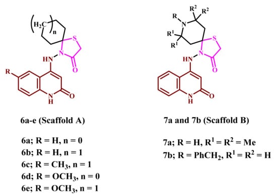 Following our previous study on dual targeting strategies and motivated by the findings above [,,], we synthesized new spiro-compounds that combine quinolinone, thiazolidinone, and spiro-cyclic in a single molecule via the reaction of thioglycolic acid and 4-(2-cyclodenehydrazinyl)4uinoline-2(1H)-one. As a result, two new compounds, 6a–e (Scaffold A) and 7a and 7b (Scaffold B), were developed to generate new potent antiproliferative agents targeting EGFR and/or BRAFV600E, as shown in Figure 3.