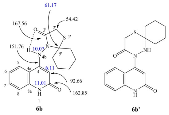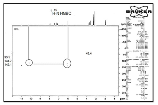 The possibility of an isomeric structure in compound 6b′ (Figure 4) was ruled out by 1H NMR, which revealed an NH chemical shift at 10.07 ppm due to hydrogen bonding with the carbonyl group (C-3′). Furthermore, the 15N NMR spectrum revealed a signal at δN = 131.7 ppm, which produced an HSQC correlation with the proton at δH = 10.07 ppm. An HMBC correlation with two protons at δH = 10.07 and 6.11 ppm, assigned as NH-4b and H-3, was also indicated (Figure 5). The latter applies to structure 6b but not 6b′. Furthermore, the two signals at δN = 142.1 ppm, designated as NH-1, show an HSQC correlation with the proton at H 6.11 ppm, designated as H-3. These correlations are not possible for structure 6b′.
