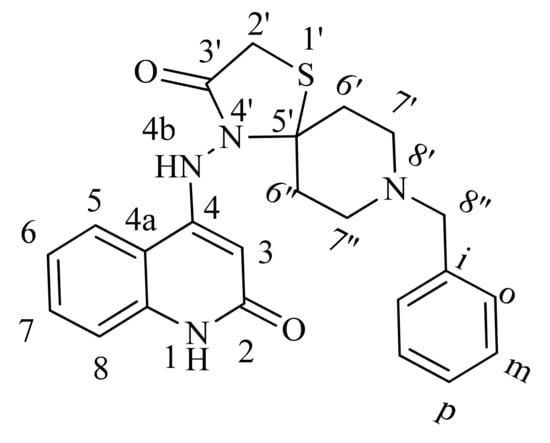 For example, consider compound 7b, which was designated as 8-benzyl-4-((2-oxo-1,2-dihydroquinolin-4-yl)amino)-1-thia-4,8-diazaspiro[4.5]decan-3-one with the molecular formula C23H24N4O2S (Figure 6, Table 1). The 1H NMR of compound 7b revealed that H-3 was distinctive as the vinylic singlet at δH 6.08 ppm, with its attached carbon appearing at δC 92.33 ppm. Furthermore, H-3 exhibits an HMBC correlation with both protonated nitrogens at δN 141.9 and 132.0 ppm. The latter could be N-1 and N-4b, although it is unclear which was which. Furthermore, N-1 exhibits an HMBC correlation with the proton resonance at δH 7.28 ppm, implying that H-8 is present. Of the two carbons that exhibit an HSQC correlation with this proton, the one at δC 115.45 ppm exhibits an HMBC correlation with the protons in the quinoline ring, designated as C-8. The only visible 1H doublet in the aromatic region appears at δH 7.98 ppm and is assigned to H-5, whose attached carbon appears at δC 122.44 ppm. H-5 establishes a COSY correlation with the dd at δH 7.12 ppm, designated as H-6. The attached carbon appears at δC 120.31 ppm in H-6, establishing a COSY correlation with the other dd, at δH 7.46, designated as H-7. Attached carbon appears at δC 130.13 ppm in H-7. In turn, H-7 establishes a COSY correlation with H-8. The carbon at δC 139.23 establishes an HMBC correlation with H-5 and H-7, designated as C-8a. The carbon at δC 112.26 establishes a strong HMBC correlation with H-3, NH-4b, H-6, and H-8, designated as C-4a. These six HMBC correlations are three-bond correlations. The carbon at δC 162.90 establishes an HMBC correlation with H-3 and (weakly) NH-4b, designated as C-2. The carbon at δC 149.51 establishes an HMBC correlation with H-3, NH-4b, H-5, and (weakly) H-8, designated as C-4. This arrangement constituted the quinolinone structure.