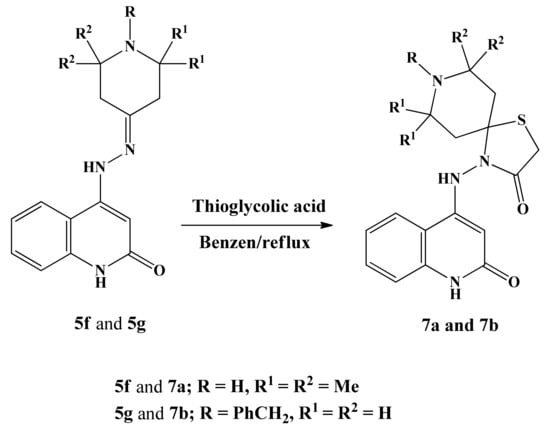 We also investigated the reaction of thioglycolic acid with 4-(2-(2,2,6,6-tetramethylpiperidin-4-ylidene)hydrazinyl)quinolin-2(1H)-one (5f) and 4-(2-(1-benzylpiperidin-4-ylidene) hydrazine-yl)quinolin-2(1H)-one (5g). The reaction followed the same pattern and produced similar products, 7a and 7b, in high yields (Scheme 2).