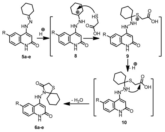 Compounds 6a–e were synthesized by cyclizing the corresponding hydrazones 5a–e with thioglycolic acid according to the suggested mechanism in Scheme 3. Compounds 5a–c were catalyzed with thioglycolic acid to form tertiary carbocation 8 and a nucleophilic addition of HS-thioglycolic, followed by rearrangement with the loss of an H+-proton to produce the intermediate 9. Nucleophilic attacks from NH-2 to the carbonyl group eliminated an H2O molecule, yielding the corresponding products 6a–e via intermediates 9 and 10. Compounds 7a and 7b were also formed via a similar mechanism.