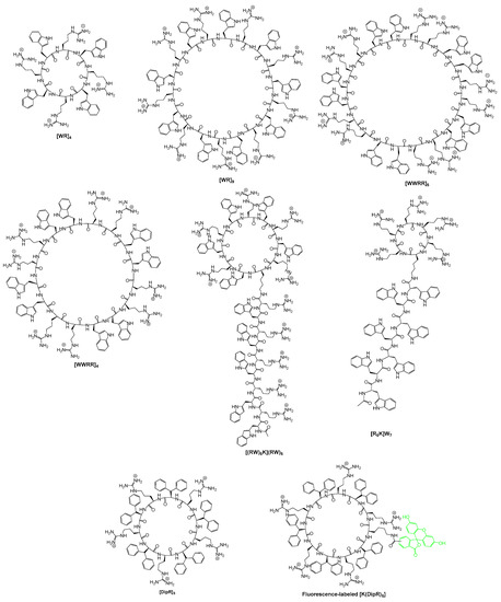 - Kim, L.; Lohan, S.; Moreno, J.; Zoghebi, K.; Tiwari, R.K.; Parang, K. Cyclic and linear peptides containing alternate WW and RR residues as molecular cargo delivery tools. Mol. Pharm. 2023, 20, 341–356. [Google Scholar] [CrossRef]