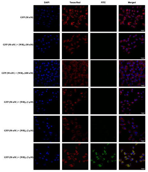 - Patel, S.G.; Sayers, E.J.; He, L.; Narayan, R.; Williams, T.L.; Mills, E.M.; Tsai, Y.H. Cell-penetrating peptide sequence and modification dependent uptake and subcellular distribution of green fluorescent protein in different cell lines. Sci. Rep. 2019, 9, 6298. [Google Scholar] [CrossRef]
