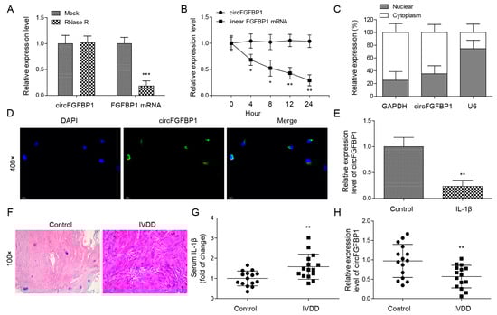 Ectopic expression of circFGFBP1 in NP cells and tissues of IVDD. (A) Expressions of circFGFBP1 and FGFBP1 mRNA by qPCR. (B) RNA stability assay by actinomycin D. (C,D) Subcellular distribution of circFGFBP1 by qPCR (C) and FISH (D). (E) CircFGFBP1 expression in NP cells stimulated by IL-1β. n = 3. (F) Histopathological changes in degenerative intervertebral disc by H&E staining. (G) Serum IL-1β by ELISA. (H) CircFGFBP1 expression in NP tissues from IVDD patients. n = 15. Data were estimated as mean ± SD. * p < 0.05, ** p < 0.01, *** p < 0.001.