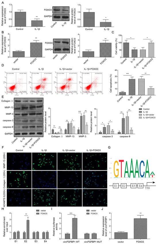 FOXO3 exerts its protection role in NP cell apoptosis and ECM degradation via activating circFGFBP1 transcription by binding to its promoter region. (A) Expression of FOXO3 in IL-1β-stimulated NP cells by qPCR and Western blot. (B) FOXO3 expression in NP cells transfected with FOXO3 overexpression vector. (C) NP cell viability by CCK-8 assay. (D) Apoptosis in NP cells by flow cytometry. (E,F) Expression levels of ECM proteins by Western blot (E) and immunofluorescence (F). (G) The potential site of FOXO3 located in circFGFBP1 promoter by JASPAR. (H,I) The functional relation between FOXO3 and circFGFBP1 through ChIP (H) and dual luciferase reporter gene assay (I). (J) CircFGFBP1 expression by qPCR under FOXO3 upregulation. Data were estimated as mean ± SD. * p < 0.05, ** p < 0.01, *** p < 0.001.