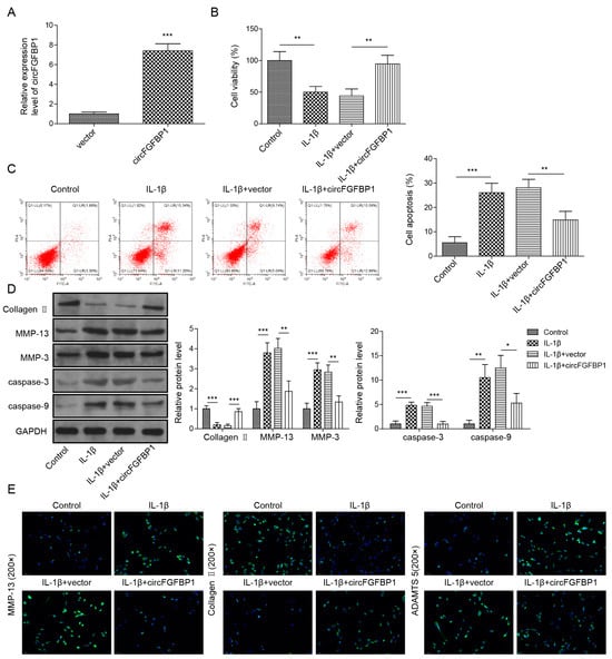 Overexpression of circFGFBP1 prevents apoptosis and ECM degradation in NP cells. (A) CircFGFBP1 expression by qPCR. (B) Cell viability by CCK-8 assay. (C) Apoptosis in NP cells by flow cytometry. (D,E) Expressions of ECM proteins by Western blot (E) and immunofluorescence (E). Data were estimated as mean ± SD. * p < 0.05, ** p < 0.01, *** p < 0.001.