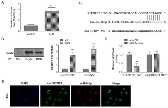 CircFGFBP1 serves as a miRNA sponge of miR-9-5p. (A) miR-9-5p expression by qPCR. (B) The potential site of circFGFBP1 located in miR-9-5p by starBase. (C,D) The relationship between circFGFBP1 and miR-9-5p via RIP-qPCR (C) and dual luciferase reporter gene assay (D). (E) The colocalization of circFGFBP1 and miR-9-5p by FISH. Data were estimated as mean ± SD. ** p < 0.01, *** p < 0.001.