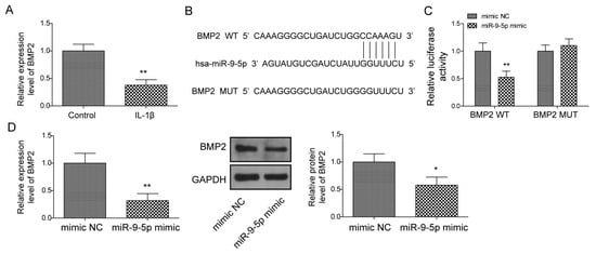 BMP2 is identified as a target of miR-9-5p. (A) BMP2 expression under IL-1β stimulation using qPCR. (B) The potential site of miR-9-5p located in BMP2 by starBase. (C) The relationship between miR-9-5p and BMP2 via dual luciferase reporter gene assay. (D) BMP2 expression by qPCR and Western blot. Data were estimated as mean ± SD. * p < 0.05, ** p < 0.01.