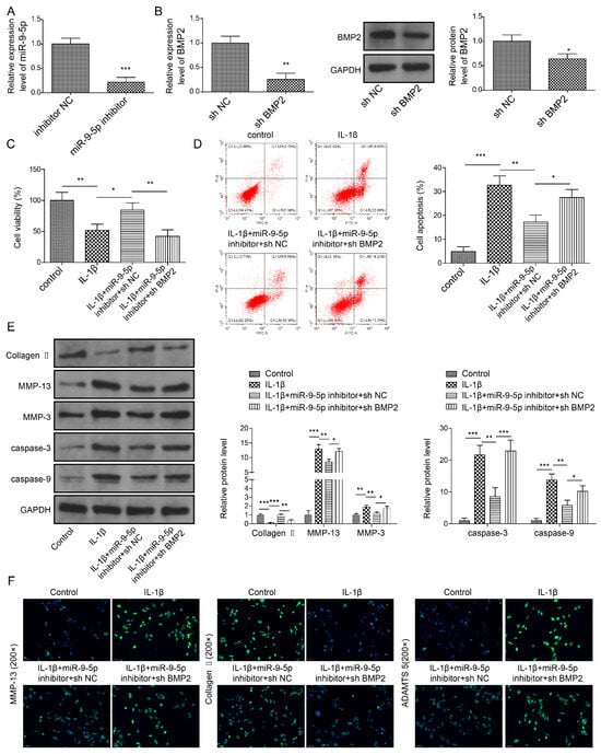 Knockdown of miR-9-5p suppresses apoptosis and ECM degradation by targeting BMP2 in NP cells. (A) MiR-9-5p expression by qPCR. (B) BMP2 expression by qPCR and Western blot. (C) Cell viability by CCK-8 assay. (D) Apoptosis in NP cells by flow cytometry. (E,F) Expressions of ECM proteins and apoptosis-related proteins by Western blot (E) and immunofluorescence (F). Data were estimated as mean ± SD. * p < 0.05, ** p < 0.01, *** p < 0.001.