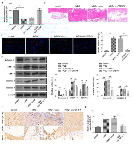 Overexpression of circFGFBP1 alleviates the progression of IVDD in vivo. (A) CircFGFBP1 expression in NP tissues by qPCR. (B) Histopathological changes by H&E staining. (C) Apoptosis in NP tissues by TUNEL staining. (D) Expressions of ECM proteins in NP tissues by Western blot. (E) Expressions of BMP2 and MMP-13 in in NP tissues by immunohistochemistry. (F) Expression of miR-9-5p by qPCR. Data were estimated as mean ± SD. * p < 0.05, ** p < 0.01, *** p < 0.001.
