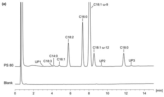 - Ilko, D.; Braun, A.; Germershaus, O.; Meinel, L.; Holzgrabe, U. Fatty Acid Composition Analysis in Polysorbate 80 with High Performance Liquid Chromatography Coupled to Charged Aerosol Detection. Eur. J. Pharm. Biopharm. 2015, 94, 569–574. [Google Scholar] [CrossRef]