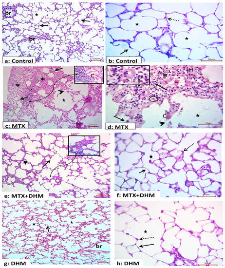 Effect of treatment with dihydromyricetin (DHM, 300 mg/kg, p.o) on methotrexate (MTX, 40 mg/kg, i.p)-induced histopathological changes in lung tissues. Photomicrographs showing lung sections of all groups (n = 6, each): control group (a,b) showed normal structure of the lung tissues; numerous alveoli (stars) are separated by delicate septa of connective tissue (arrows). Higher magnifications show several connected clear alveoli (stars) lined by pneumocyte type I (arrows) and type II (dashed arrows). MTX group (c,d) showed disturbed structures; decreased alveoli (stars) with areas of consolidation (*), coalescence of numerous alveoli (stars) with degeneration of their alveolar septa (arrowhead), marked increase in the thickness of inter-alveolar septa (arrows) with inflammatory cell infiltration (curved arrow and insets), and markedly congested blood vessels. Notice interstitial hemorrhage (IH) and inflammatory cells mainly lymphocytes (double head arrows) and eosinophils (circles). The DHM + MTX group (e,f) showed marked morphological improvement, with few areas showing thickening of the alveolar septa (curved arrow and inset). The DHM group (g,h) showed normal morphological changes, with numerous alveoli (stars) separated by delicate septa of connective tissue (arrows); H&E (a,c,e,g) ×10; scale bar: 100 µm, (b,d,f,h) ×40; scale bar: 50 µm; and insets ×100 scale bar: 20 µm.