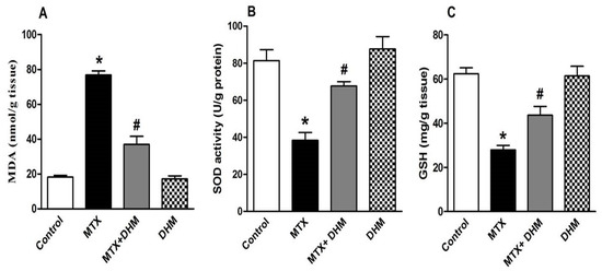 The effects of single-dose MTX (40 mg/kg) and two weeks of treatment with DHM (300 mg/kg) on the mean body weight of rats are shown in Table 1. At the beginning of the experiment, the mean body weight was comparable in all groups. However, at the end of the experiment, at day 14, the mean body weight of the MTX-treated group had significantly (p < 0.05) declined when compared to the control. However, the concurrent treatment with DHM significantly (p < 0.05) inhibited the body weight loss induced by MTX. On the other side, administration of DHM alone did not cause significant changes in the body weight when compared to the control group (Table 1).