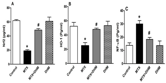Effect of 2 weeks of treatment with dihydromyricetin (DHM, 300 mg/kg, p.o) on pulmonary levels of (A) Nrf2, (B) HO-1, and (C) NF-κB in methotrexate (MTX, 40 mg/kg, i.p)-induced lung toxicity. Data are presented as means ± SEM (n = 6). * and # indicate significant differences from the control and MTX groups, respectively, at (p < 0.05).