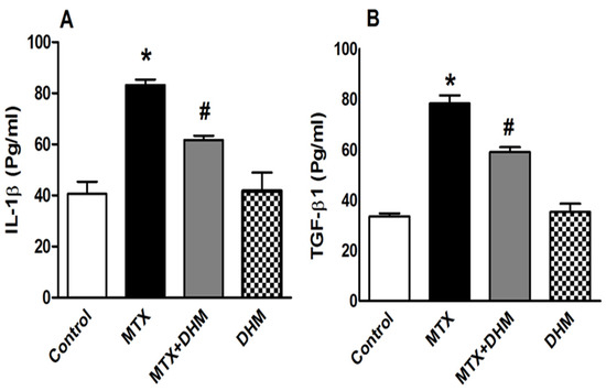 2.5. DHM Alleviated the MTX-Induced Elevation of IL-1β and TGFβ-1