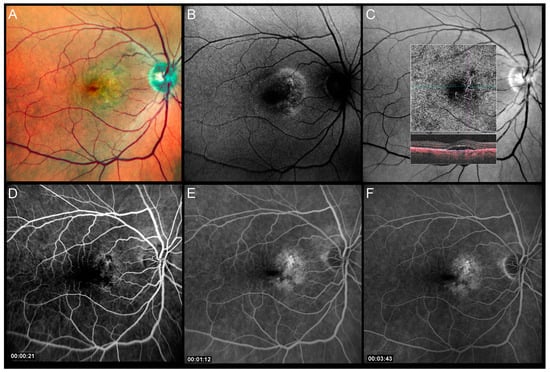 Preoperative multimodal imaging of patient 1: (A) Pseudocolor image shows pigmentary changes and thickening in the nasal part of the macula; (B) autofluorescence image, note the lobulated area with a pattern of speckled autofluorescence centrally and hyperautofluorescent borders; (C) green channel image with superimposed en face optical coherence tomography angiography and OCT B-scan showing the choroidal neovascularization; (D–F) progressive phases of the fluorescein angiogram which show slow dye diffusion confirming the presence of active macular neovascularization.