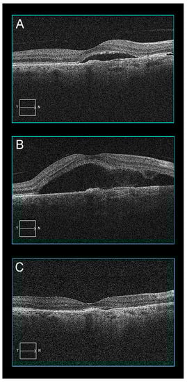 - Ramtohul, P.; Engelbert, M.; Malclès, A.; Gigon, E.; Miserocchi, E.; Modorati, G.; de Souza, E.C.; Besirli, C.G.M.; Curcio, C.A.; Freund, K.B. Bacillary layer detachment: Multimodal imaging and histologic evidence of a novel optical coherence tomography terminology. Retina 2021, 41, 2193–2207. [Google Scholar] [CrossRef]