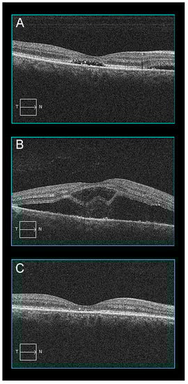 - Keane, P.A.; Aghaian, E.; Ouyang, Y.; Chong, L.P.; Sadda, S.R. Acute severe visual decrease after photodynamic therapy with verteporfin: Spectral-domain OCT features. Ophthalmic Surg. Lasers Imaging 2010, 41, S85–S88. [Google Scholar] [CrossRef]