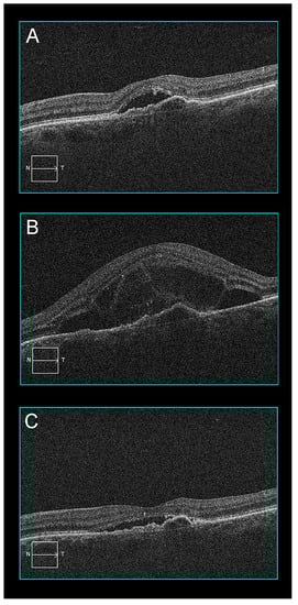 - Mehta, N.; Chong, J.; Tsui, E.; Duncan, J.L.; Curcio, C.A.; Freund, K.B.; Modi, Y. Presumed foveal bacillary layer detachment in a patient with toxoplasmosis chorioretinitis and pachychoroid disease. Retin. Cases Brief. Rep. 2021, 15, 391–398. [Google Scholar] [CrossRef]