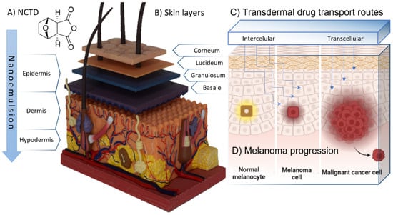 (A) Chemical structure of norcantharidin (NCTD) molecule. (B) Representation of the skin layers and epidermal strata (skin anatomy model, 4D human anatomy Fame Master® photography). (C) Transdermal formulation drug transport routes (created with BioRender®). (D) Schematic representation of melanoma progression (created with BioRender®).