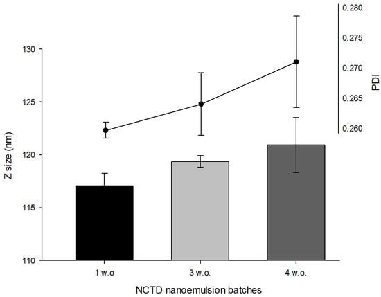 Furthermore, the measured NCTD nanoemulsions’ zeta potential was 0 mV, regardless of the batch preparation’s date and samples’ replicates (results not shown). Although this was expected, since there were no excipients in the formulation that could provide the droplets with charge, it could contribute to the nanoemulsion’s instability, as there was no electric repulsion between the droplets to keep them apart. In general, values either lower than −30 mV or above +30 mV are considered best for a more stable nanosystem. The stability of nanoemulsions is further discussed in Section 3.4.