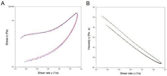 Rheological characterization was performed using a controlled stress rotational rheometer (AR G2, TA Instruments). The used geometry was a smooth 316-grade stainless steel circular parallel plate, with a 60 mm radius (Plate SST ST). Firstly, samples were placed in a Peltier plate, covered by filter paper #150, to prevent fluid displacement. Then, measurements were performed with ascending and descending stress sweep cycles, a log mode, and with a flow ramp from 10 to 150 Pa, with 30 measured points per decade and 15 s intervals between measurements, with a total duration of 675 s. Measurements were performed at 25 °C in a 1 mm gap [45].