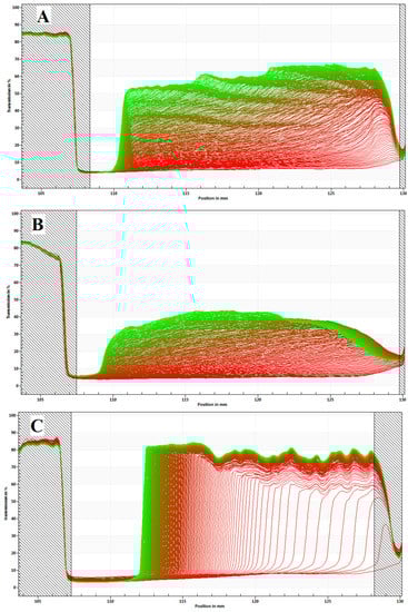 The first recorded profile (red) displays the initial distribution of the sample just after centrifugation starts, and the last recorded profiles (green) illustrate the final distribution of the particles/droplets over sample height (position r), due to separation (Figure 4). Depending on the type of dispersion, particles/droplets will show a tendency to sediment (position of the meniscus) or to form a cream (position of the cell bottom) [30]. As expected, the developed NCTD nanoemulsion formed a cream, since it is the common destabilization process for emulsions.