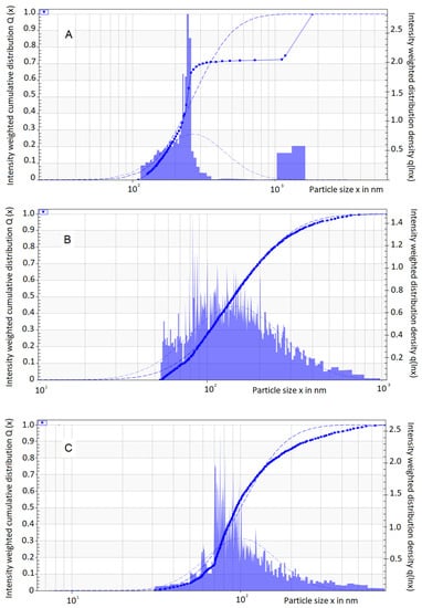 Graphical representation of droplet (particle) size distribution as a function of velocity, for batches prepared at different times: (A) 4 w.o., (B) 3 w.o., and (C) 1 w.o. Intensity-weighted distribution density (right vertical axis), intensity-weighted cumulative distribution (left vertical axis), and particle size (horizontal axis) are represented.