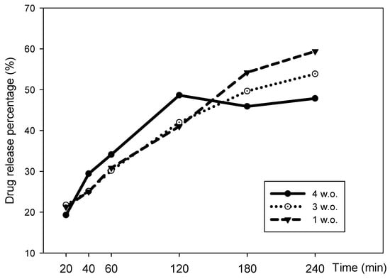 Our results showed that the most recent nanoemulsion batch (1 w.o.) had a larger cumulative drug release, reaching up to 59.4%, followed by the 3 w.o. and the 4 w.o. batches, with 53.8% and 47.8%, respectively (Figure 6). This could indicate that the formulation loses drug release capacity over time, but a multiple regression analysis revealed no significant differences between batches, and hence NCTD’s release could be considered as being consistent. The formulation showed a sustained release, which is ideal for topical drug delivery (Figure 6 and Table 2).