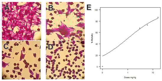 Sulforhodamine’s cell growth test of B16F1 cells exposed to different doses of NCTD. Micrographs (40×) of (A) control group, (B) 3 mg/kg, (C) 6 mg/kg, (D) 16 mg/kg; (E) graphic representation of the Log-logistic model fit of the IC50 and % of cell mortality. Plot data: For slope: −0.637, S.E.: 0.135, t-value: −4.69 (p < 0.001); and for the IC50 intersection: 1.026, S.E. 0.370, t-value 2.76 *; residual std error 6.44 and 22 degrees of freedom (p < 0.01).