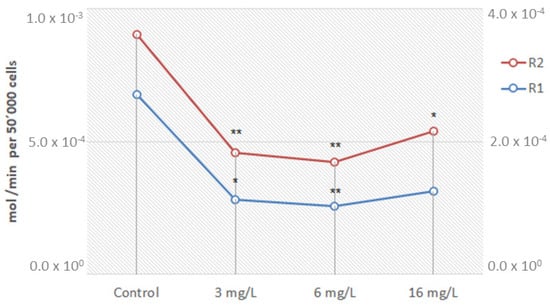 Metabolic effect in B16F1 cells after norcantharidin exposure. Data are presented as resazurin oxidized (mol/min) per 50,000 cells in duplicate (R1 right vertical axis and R2 left vertical axis; ANOVA p (same) 1.67 × 10−4 and 5.4 × 10−3, respectively). * p < 0.05; ** p < 0.01 compared to the control group.