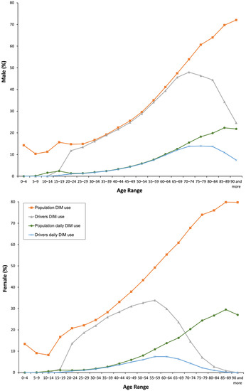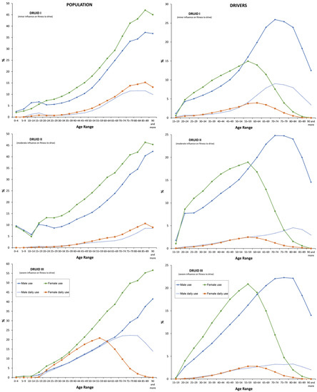 The use of DIMs, regardless of the DRUID category, is generally higher in females among the general population and in male drivers. This is most likely because in Spain males are the majority behind the wheel. Moreover, the number of driving licenses for females decreases with age [42,43,44,45,46,48].
