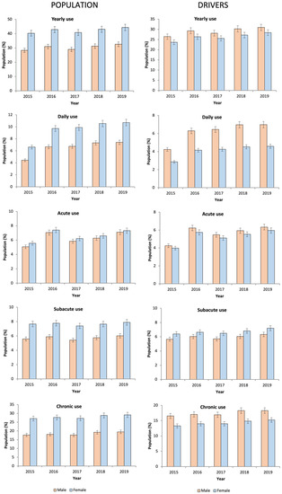 Concerning drivers, 27.91% took at least one DIM, which was higher in males than in females (29.02% vs. 26.25%). As in the general population, the use of DIMs was predominantly chronic (16.15%) with a higher use of DRUID II category medicines (15.20%) (Table 1). The use of DIMs increased with age, peaking at 55–59 years for females and 70–74 years for males (Figure 1 and Figure 2, respectively). The increase in the use of DIMs was higher than in the general population, especially in yearly use (17.96%, 29.91% in 2019 vs. 25.35% in 2015, p = 0.001) (Figure 3) and in DRUID III medicines use (26.96%, 14.71% in 2019 vs. 11.61% in 2015, p = 0.001) (Table 2). Finally, the concomitant use of medicines from different DRUID categories was similar to the general population.