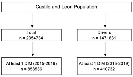 All medicines marketed in Spain with the pictogram “medicines and driving” are considered DIMs. In this sense, all DIM dispensations in pharmacies in Castile and Leon from 2015 to 2019 were considered. As in previous manuscripts [42,43,44,45,46,47,48], dispensing was considered to be an approximation of the actual consumption. The total population of Castile and Leon was considered (Table S3). Figure 4 shows the flow chart of the inclusion of the study population.