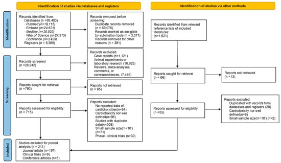 A systematic literature search was performed to identify studies that evaluated fluoropyrimidine-related cardiotoxicity. PubMed, Embase, Medline, Web of Science, Cochrane library, and clinical trials (https://clinicaltrials.gov/ accessed on 20 March 2023) were retrieved from the establishment of each database/website to 31 October 2022, with no language restrictions. The reference lists of the relevant articles were also reviewed to avoid the omission of eligible studies. The retrieval scheme used for each database is shown in Supplementary Table S1.