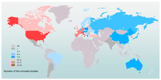A total of 211 eligible studies involving 63,186 patients were included [15,21,22,23,24,25,26,27,28,29,30,31,32,33,34,35,36,37,38,39,40,41,42,43,44,45,46,47,48,49,50,51,52,53,54,55,56,57,58,59,60,61,62,63,64,65,66,67,68,69,70,71,72,73,74,75,76,77,78,79,80,81,82,83,84,85,86,87,88,89,90,91,92,93,94,95,96,97,98,99,100,101,102,103,104,105,106,107,108,109,110,111,112,113,114,115,116,117,118,119,120,121,122,123,124,125,126,127,128,129,130,131,132,133,134,135,136,137,138,139,140,141,142,143,144,145,146,147,148,149,150,151,152,153,154,155,156,157,158,159,160,161,162,163,164,165,166,167,168,169,170,171,172,173,174,175,176,177,178,179,180,181,182,183,184,185,186,187,188,189,190,191,192,193,194,195,196,197,198,199,200,201,202,203,204,205,206,207,208,209,210,211,212,213,214,215,216,217,218,219,220,221,222,223,224,225,226,227,228,229,230] (Figure 1). Table 1 summarizes the characteristics of the included studies. The involving population covered 31 countries or regions in the world (Figure 2). According to the NIH quality assessment tools, 61 articles (28.9%) had a good quality score, 150 (71.1%) fair quality, and none was classified as poor (high risk of bias). The detailed information of each included study is shown in Supplementary Table S3.