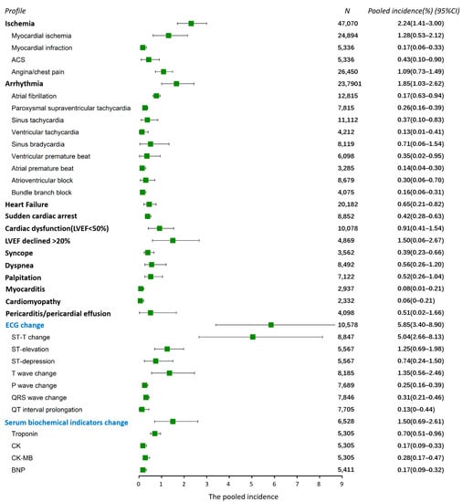 The profile of FAC includes a variety of disease and symptoms, and, in our study, more than 38 different types of cardiac AEs were reported (Figure 3). From the results of this analysis, cardiac ischemia and arrhythmia were the two most common AEs, occurring in 2.24% (95% CI 1.41–3.00%) and 1.85% (95% CI 1.03–2.62%) of patients, respectively. Heart failure developed in 0.65% of the population (95% CI 0.21–0.82%), probably as a result of severe events following cardiac ischemia and arrhythmia. The left ventricular ejection fraction (LVEF) decreased ≥20% in 1.5% (95% CI 0.6–2.67%) of patients, and 0.91% (95% CI 0.41–1.54%) had cardiac dysfunction (LVEF < 50%). ECG alterations were reported in 37 studies, with a pooled incidence of 5.85% (95% CI 3.4–8.9%), slightly higher than the incidence of FAC (5.18%), indicating asymptomatic ECG alterations in a subset of the population. The ST-T change was the most frequently observed (5.04%, 95% CI 2.66–8.13%), which represents an indicator of cardiac ischemia. Additionally, serum biochemical changes were reported in 16 studies, with a pooled incidence of 1.5% (95% CI 0.69–2.61%).