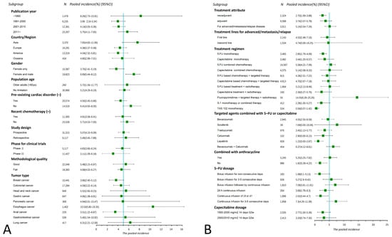 Pre-treatment FAC risk assessment should ideally be performed, and the HFA-ICOS risk assessment tools can be considered [233]. Several studies suggested that FACs varied with the population characteristics, cancer types, and treatment regimens [237]. In contrast, other studies found that these factors were insignificant [95]. Our study performed a comprehensive sub-analysis to assess the influences of these variations on FAC, which is useful for indicating the risk factors of FAC. Being female was reported to be a protective factor for myocardial infarction and ischemia [238]. As shown in our results, the incidence of FAC decreased as the proportion of females increased, and the female-only population had a significant lower incidence than the general population. The lower cardiotoxicity was probably due, to some extent, to the protective effect of female hormones. On the other hand, it could also be related to the specific cancer type and regimens, since all patients in the female-only subgroup suffered from breast cancer, and most of them underwent capecitabine-based regimens (1000 mg/m2, d1–14, Q3w).