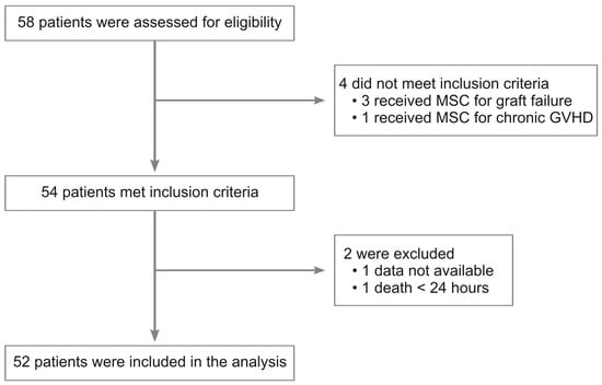 Results were expressed as mean ± standard deviation or median (range) according to distribution characteristics and proportions. When two groups were compared, a two-sided unpaired Student’s t-test (for parametric data) or a Mann–Whitney test (for non-parametric data) was used. Categorical variables were presented as frequency (%) and compared using a chi-square test or Fisher’s exact test. Overall survival (OS) estimates were calculated using the Kaplan–Meier method, and differences between the groups were assessed by the log-rank test. Time to events was calculated in days and months from the diagnosis of aGVHD to the day of the first MSC administration, and from this to death or the last date of follow-up, respectively. The results were considered to be statistically different when the p-value was below 0.05 (by two-tailed testing). Statistical analyses were performed using statistical GraphPAD Prism software, version 9.5.0.