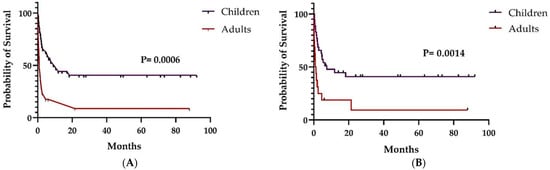 Overall (A) and relapse-free survival (B) in children and adults (after MSC infusion).