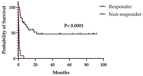 In our study, OS at day 100 was lower than that observed in the two studies of Kurtzberg et al. [29,30]. Nevertheless, considering only the children of our study, the difference appears to be not significant (62.9% vs. 74.1% and 66.9%). Additionally, OS in children is much better than that observed in adults, which is in accordance with Kebriaei et al. [37]. Furthermore, OS at day 180 was inferior to that observed by Kurtzberg et al. [29] and similar to that found by others [37,38]. Nevertheless, all patients from the study by Kurtzberg et al. received MSC as second-line therapy and earlier than our cohort (12 vs. 36 days), which could be the explanation for the better outcomes [29]. This suggests that MSC infusion should be instituted as soon as possible. Additionally, as expected, OS in the responder group, defined as those who achieved a 28-day OR, was superior to that observed in the non-responder group, as had been previously shown by others [29,38].