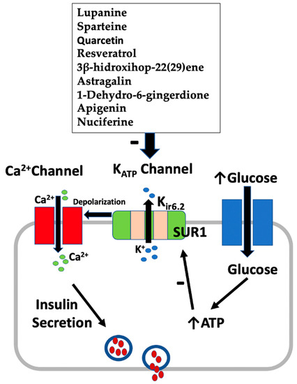 - Wiedemann, M.; Gurrola-Díaz, C.M.; Vargas-Guerrero, B.; Wink, M.; García-López, P.M.; Düfer, M. Lupanine Improves Glucose Homeostasis by Influencing KATP Channels and Insulin Gene Expression. Molecules 2015, 20, 19085–19100. [Google Scholar] [CrossRef] [PubMed]