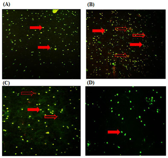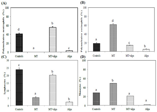 Compared to the control group, MT-treated rats induced an increase in WBC (green/yellow fluorescence (intact DNA) with the presence of a few nuclear fragmentations in WBC revealed by red/orange fluorescence (damaged DNA) (Figure 4B). However, algal supplementation improved mean cells’ damage and decreased the frequency of damaged DNA (Figure 4C). No significant difference in WBC morphology was noted in rats treated with the alga extract alone (Figure 4D).