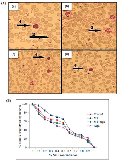 As shown in Figure 3B, the group treated with MT showed an increase in osmotic fragility compared to untreated rats. In contrast, the co-treatment of MT-treated rats with FRE ameliorates this percentage.