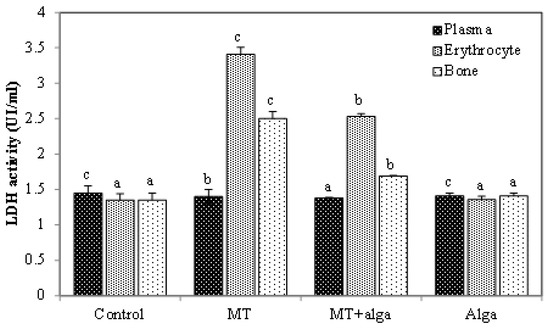 LDH activity was increased in erythrocytes and bone and decreased in plasma in MT-treated rats (Figure 5). Co-treatment with FRE restored LDH activity in both tissues.