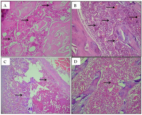 Optical microscopy histological sections of the bone marrow stained with hematoxylin-eosin (H&E) of adult rats. (A) Controls group; (B) Rats treated with MT; (C) Rats treated with MT + FRE and (D) Rats treated with FRE; Arrows indicate the following:
