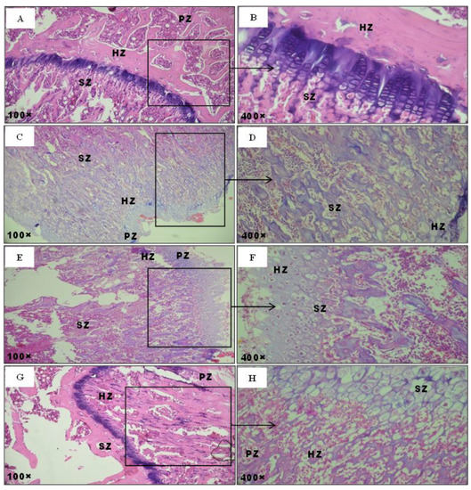 Optical microscopy histological sections of the femur stained with hematoxylin-eosin (H&E) of adult rats. (A,B) controls group; (C,D) rats treated with MT; (E,F) rats treated with MT + FRE; (G,H) rats treated with FRE. Arrows indicate the following: PZ: proliferative zone; HZ: hypertrophic zone; SZ: spongy zone.