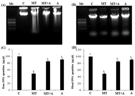 (A) Agarose gel electrophoresis of the bone DNA fragmentation. MT, marker (1 kb DNA ladder); lane 1, controls group; lane 2, MT treated group (MT); lane 3, MT + FRE-treated group (MT + A); lane 4, FRE-treated group; (B) Agarose gel electrophoresis of the WBCs DNA fragmentation. MT, marker (1 kb DNA ladder); lane 1, control group (C); lane 2, MT treated group (MT); lane 3, MT + FRE-treated group (MT + A); lane 4, FRE-treated group (A); (C) Bone DNA quantities of controls (C) and rats treated with MT (MT), MT + FRE (MT + A), and FRE (A) after 7 days; (D) Bloob DNA quantitie controls s of (C) and rats treated with MT (MT), MT + FRE (MT + A), and FRE (A) after 7 days. a,b,c indicate significant differences between experimental groups (p < 0.05).