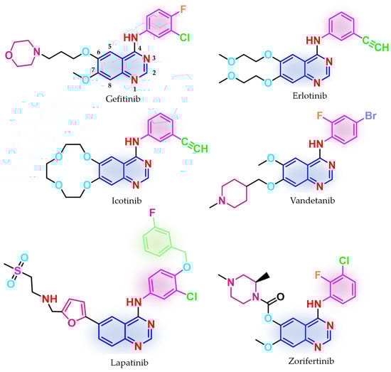 Chemical structures of first-generation quinazoline-based EGFR inhibitors approved in therapy and under clinical trial: gefitinib, erlotinib, icotinib, lapatinib, vandetanib, and zorifertinib.